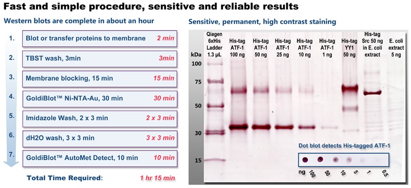 A sharply defined western blot shows the clarity of Ni NTA-Nanogold as a fast, cheap, archival stain for His tags.