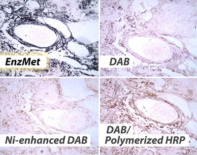 EnzMet™ replaces DAB or any other peroxidase-activated chromogen or fluorogenic substrate to provide sharp, clear, permanent results.