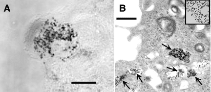 Figure 8. (A) Light micrograph of the in vitro uptake and aggregation of lipoic acid AuNPs in the cytoplasm of one tumor cell. Bar = 10 μm.