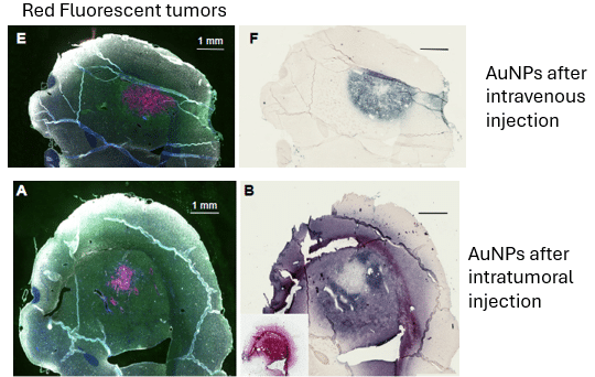 Intravenous AuNPs better target brain tumors than injecting them directly into the tumors.