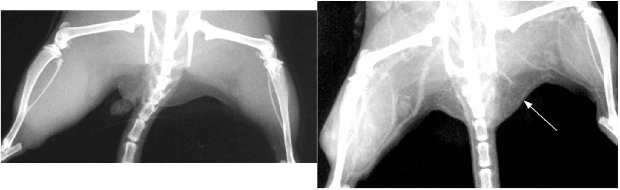 Fig. 2. Left: X-ray of mouse legs.  Right: 2 minutes after intravenous injection of gold nanoparticles making small vessels visible (arrow) and increased vascularity seen in the brighter leg on the left where a tumor is growing.
