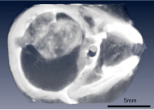 Fig. 3. Brain tumor in mouse clearly imaged after IV injection of gold nanoparticles.
