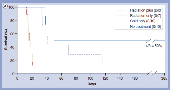 After intravenous gold nanoparticle injection, the gold loaded tumors and made the radiotherapy more effective. 0% survived 1 year with no treatment, 20% with RT alone, 50% with AuNPs, and 86% with a double dose of AuNPs.