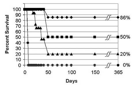 Fig. 1. After intravenous gold nanoparticle injection, the gold loaded tumors and made the radiotherapy more effective. 0% survived 1 year with no treatment, 20% with RT alone, 50% with AuNPs, and 86% with a double dose of AuNPs.