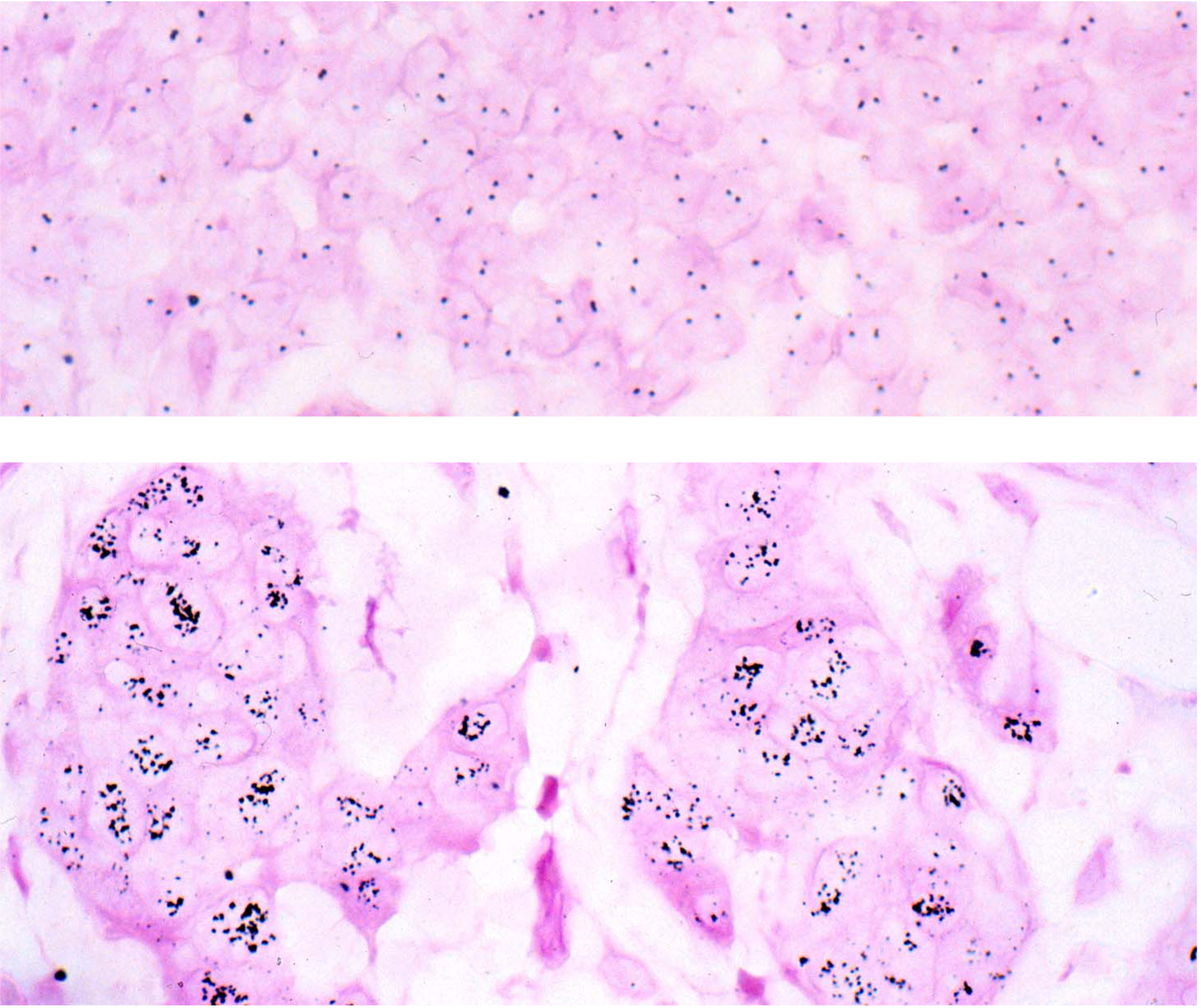 Fig. 14. Her2 breast cancer test.  In these human breast biopsies, our sensitive EnzMet detection method was used to visualize the Her2 gene (out of ~25,000 other genes).  Top image is from a Her2 negative patient showing the normal 2 genes per cell.  The bottom image is from a patient showing the gene duplication that happens in Her2 cancer, with multiple copies in the nuclei.