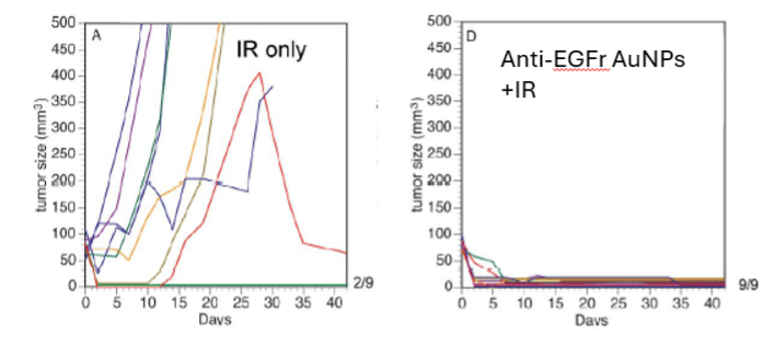 By controlling the aggregation of spherical AuNPs, their absorption could be shifted to the infrared (IR) and thus heated with an infrared laser.  We showed that anti-EGFr antibody targeted AuNPs irradiated with an IR laser could “cure” all tumors (Fig. 7).