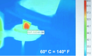 Thermal camera image of tumor on leg of mouse being heated when immersed in an alternating magnetic field.