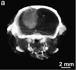 Brain tumor in mouse clearly imaged after IV injection of gold nanoparticles.
