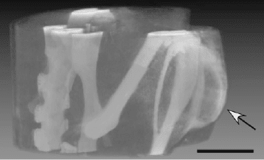 Figure 5. Micro-CT volume images from live mouse with Her2+ tumor (arrow).  Imaging was 20 h after iv injection of Herceptin–15 nm AuNPs. Bar 55 mm.
